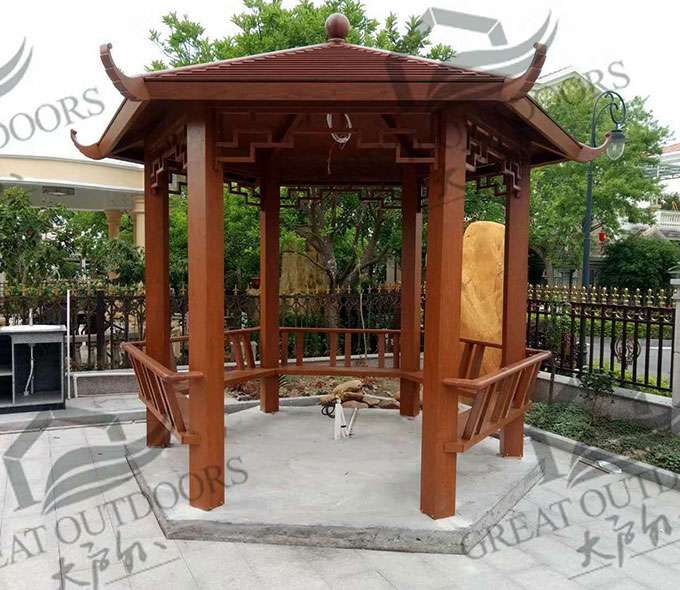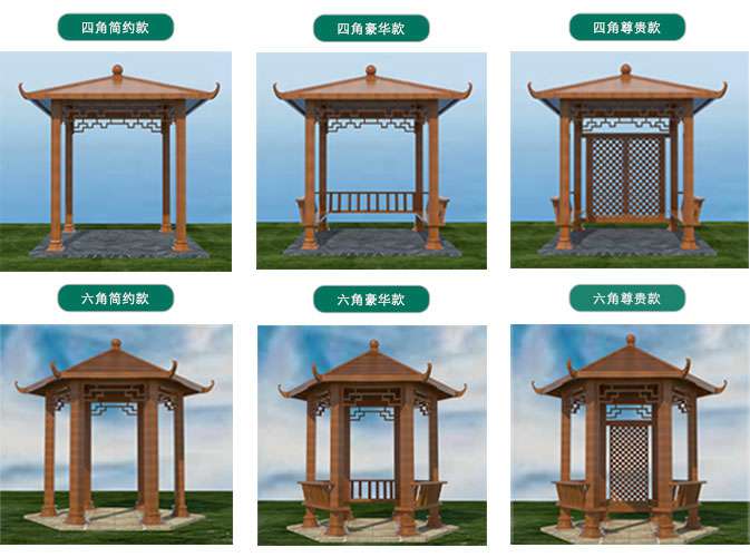 款式:四角凉亭、六角凉亭、八角凉亭、六角双层凉亭、六角双层弯弧凉亭、欧式凉亭