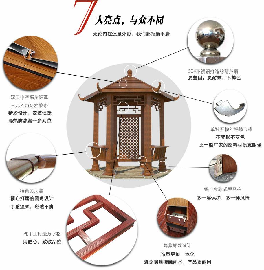 亚新官方端网站登录入口-亚新(中国)凉亭系列产品是采用高强度铝合金为原材料,经酸洗铬化,电泳或静电喷涂,木纹转印处理后,精密定制设计,保障安装。它具有防水防潮,不膨胀不变形,防腐蚀,具有逼真的木质感。成为别墅住宅及市政园林等建筑美丽的风景。